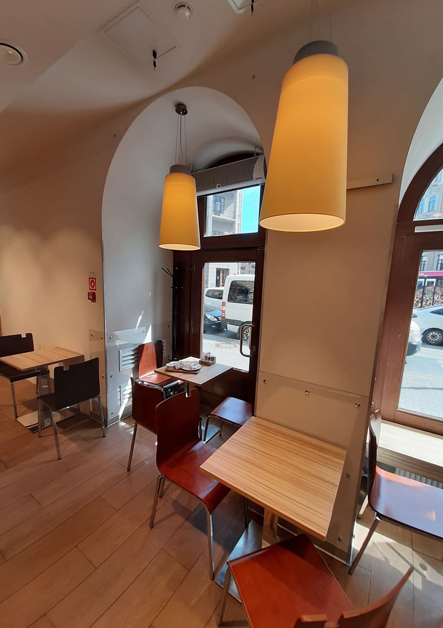 Необходимо было сохранить видимость и оградить посетителей в зоне кафе от солнечного тепла. Использовали плёнку AIR 75.