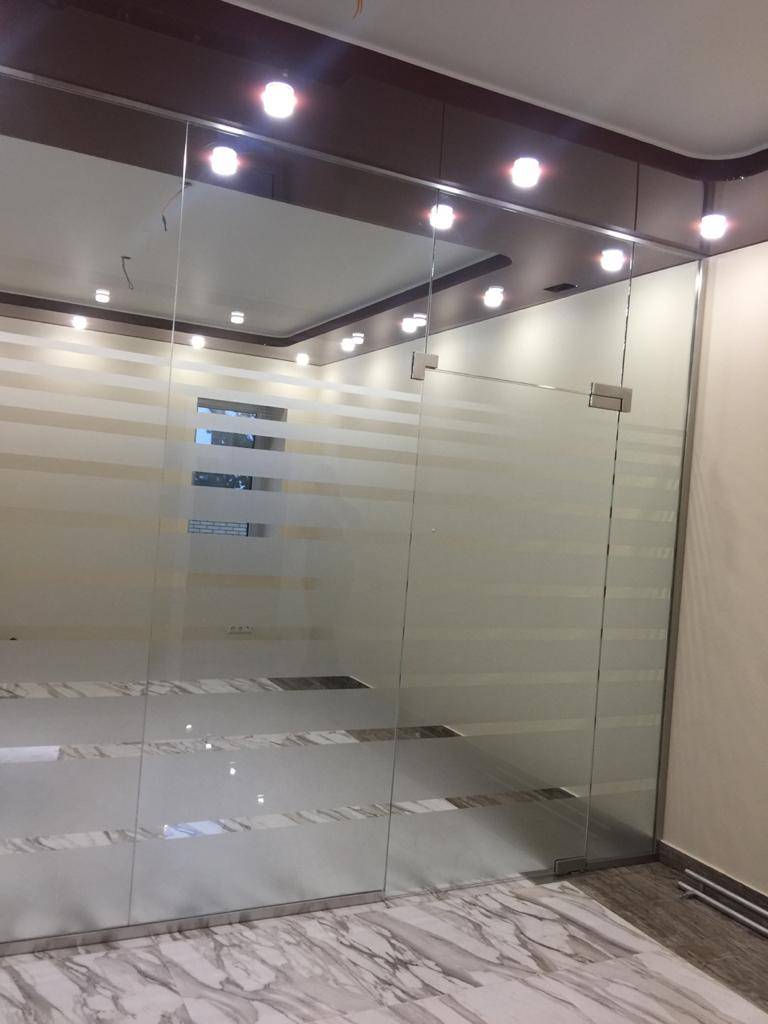 Установка полос из STV 220 на стёкла перегородки в нотариальной конторе.