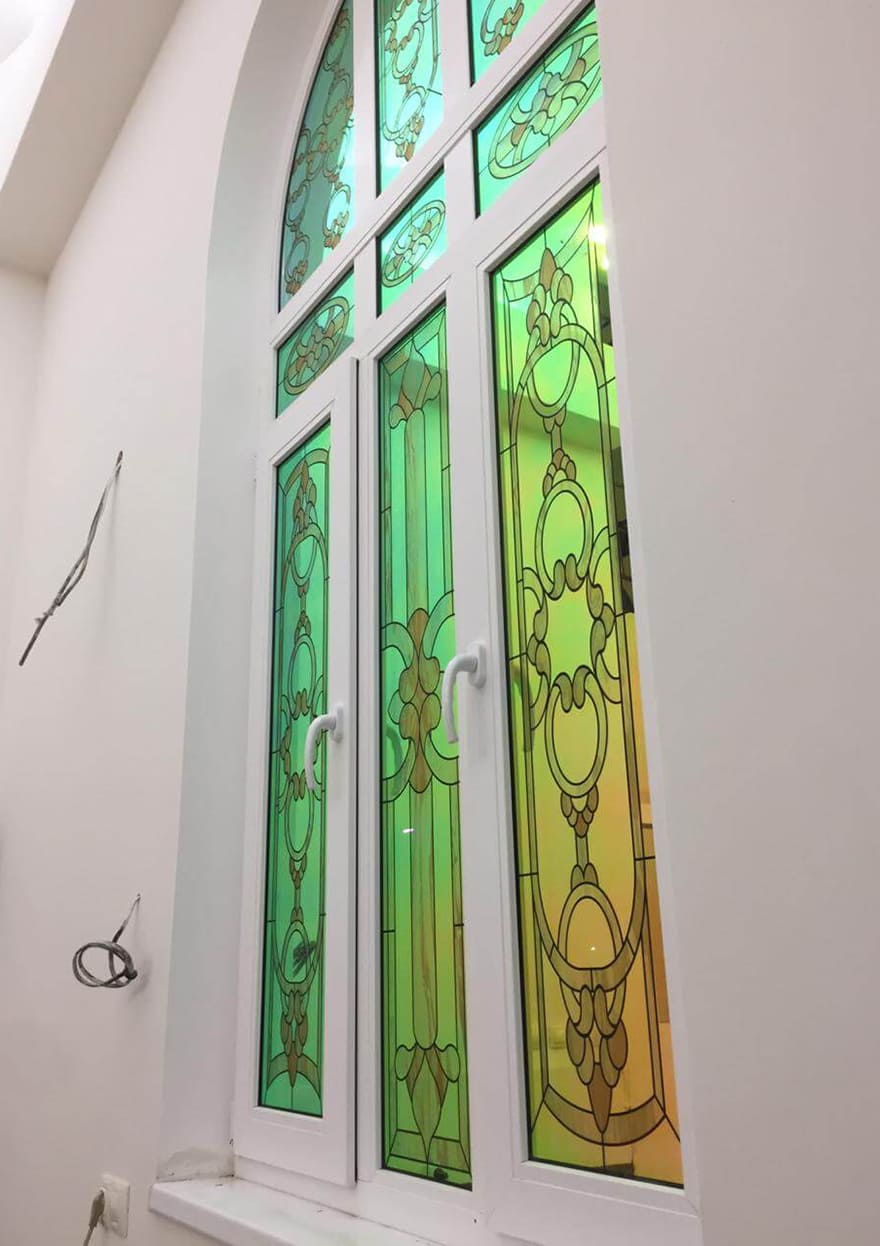 В витражном остеклении был применён способ прямой UV-печати на инновационной дихроичной плёнке DC BLUE DICHROIC FILM.