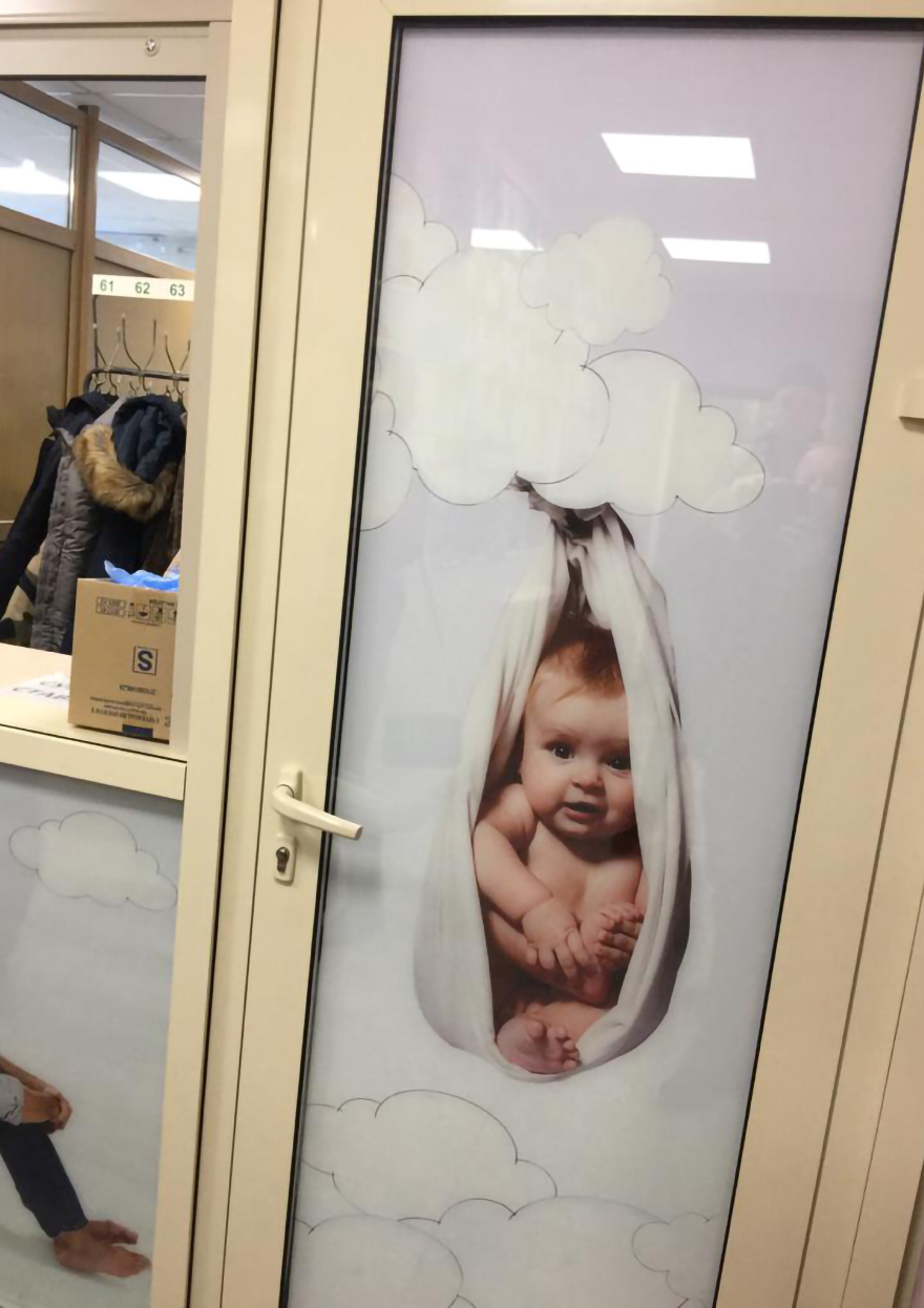 Установка УФ-печати на окна гардероба в женской консультации № 22.