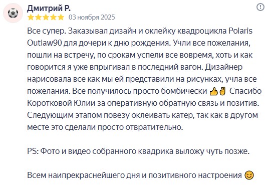 Все супер. Заказывал дизайн и оклейку квадроцикла Polaris Outlaw90 для дочери к дню рождения. Учли все пожелания, пошли на встречу, по срокам успели все вовремя, хоть и как говорится я уже впрыгивал в последний вагон. Дизайнер нарисовала все как мы ей представили на рисунках, учла все пожелания. Все получилось просто бомбически!!! Спасибо Коротковой Юлии за оперативную обратную связь и позитив. Следующим этапом повезу оклеивать катер, так как в другом месте это сделали просто отвратительно.