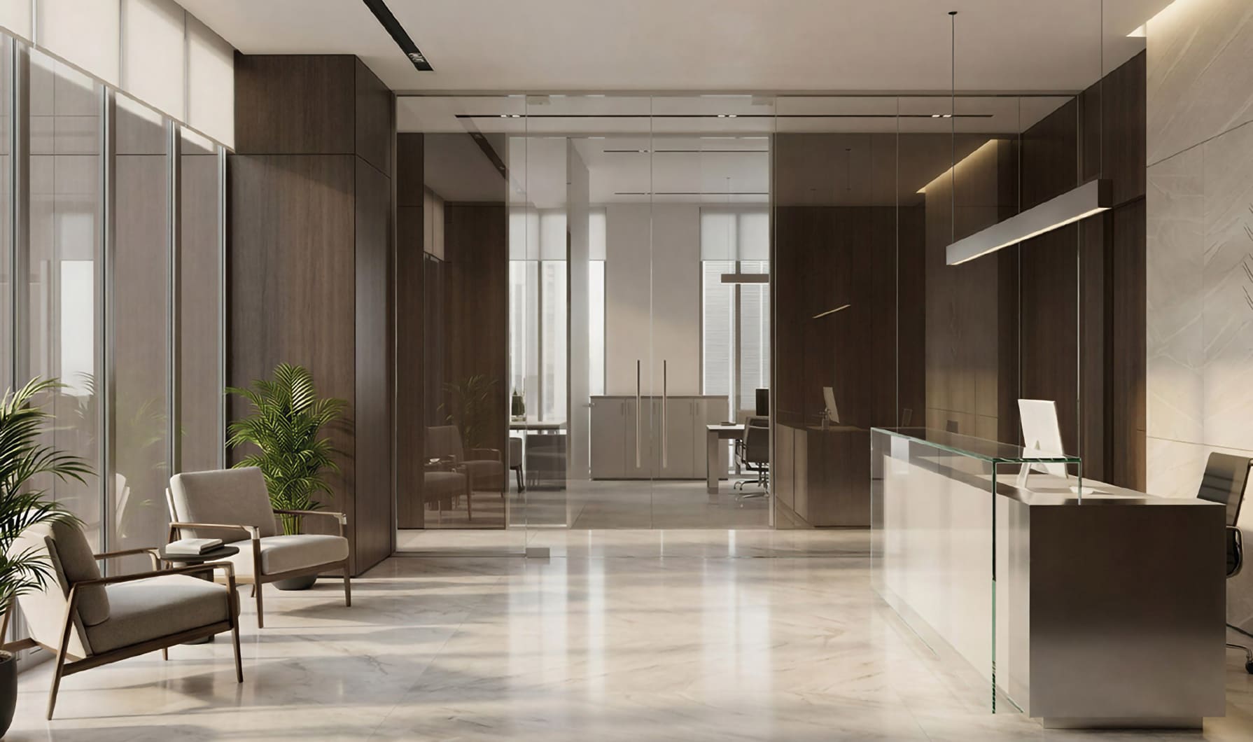 Атермальные плёнки отражают значительную часть инфракрасного излучения ещё до того, как энергия достигает стекла, что позволяет снижать нагрев воздуха внутри помещения без заметного затемнения. При этом стекло остаётся прозрачным, не изменяет визуальный облик фасада и сохраняет естественное освещение. Это важно для офисов, торговых пространств, административных зданий и жилых помещений с панорамными окнами, где необходимо сочетать комфортный микроклимат, световой комфорт и аккуратный внешний вид.
