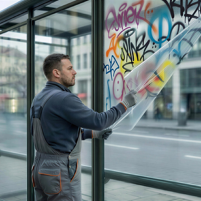 Плёнка принимает на себя агрессивное воздействие маркеров, аэрозольных красок, клея и царапин, сохраняя целостность и внешний вид поверхности под ней.