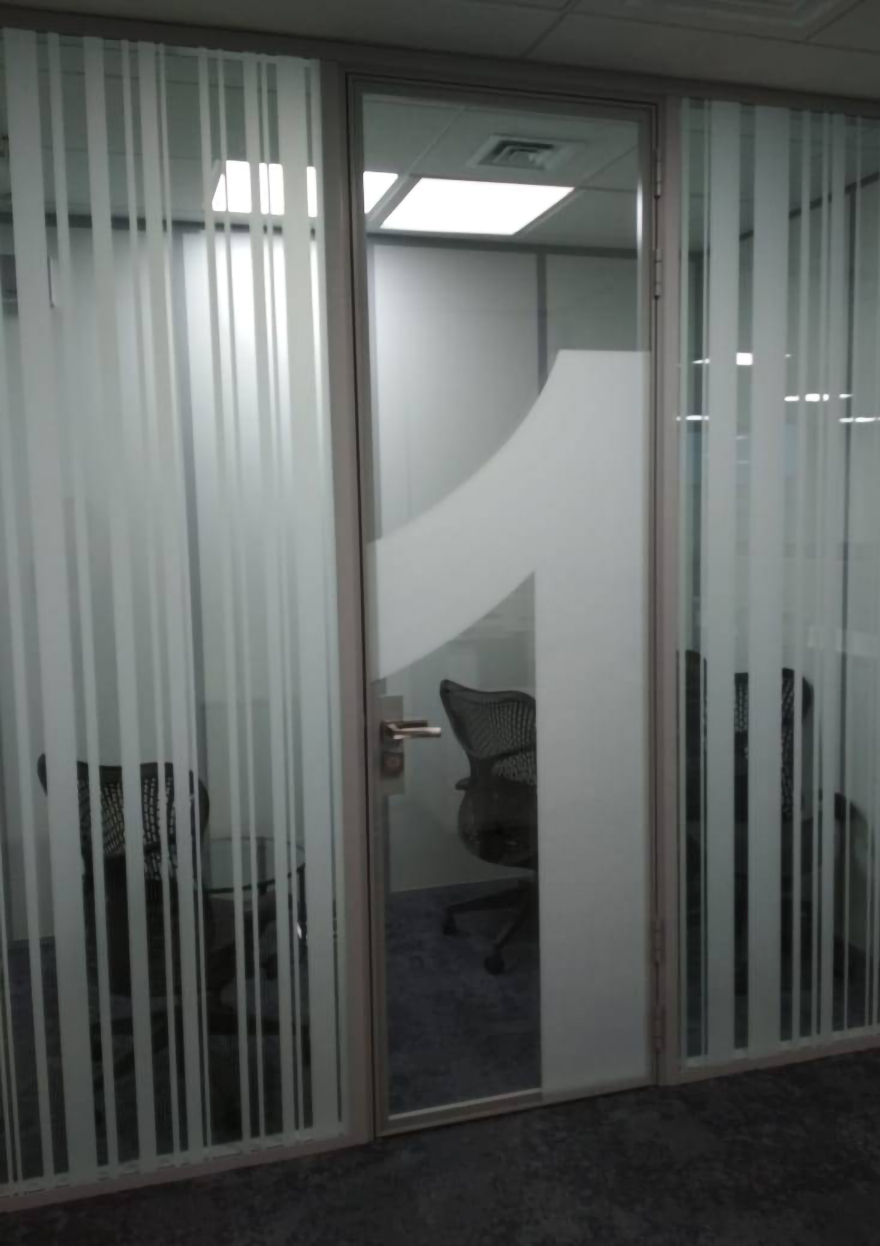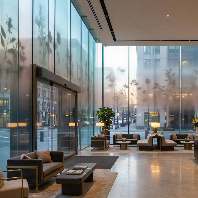 Интерьерное решение для оформления стеклянных поверхностей с акцентом на дизайн, приватность и визуальное зонирование.
