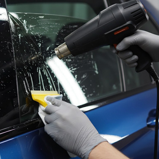 Самостоятельное снятие возможно, но оно часто приводит к повреждению стекла, появлению царапин, остатков клея и риску обрыва нитей обогрева. Профессиональное растонирование позволяет избежать этих проблем и получить чистый, прозрачный результат.